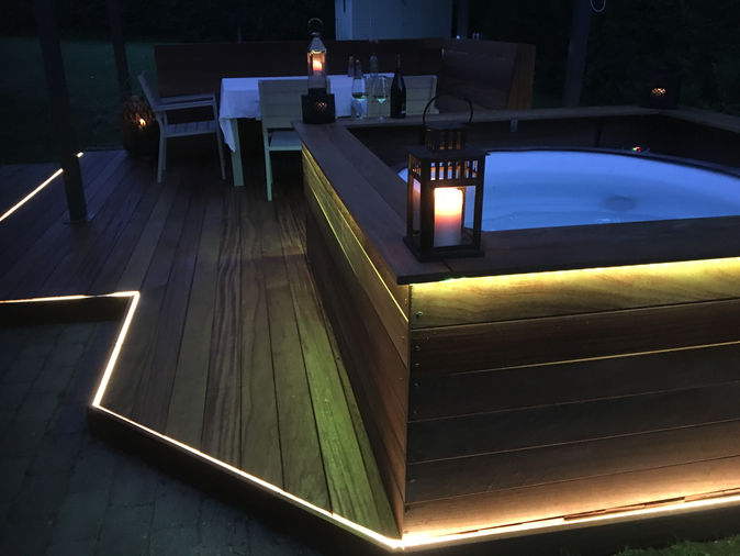 Wir wollen eine Relax-Umgebung schaffen, die Klasse aussieht, komfortabel und multi-funktional ist und auch nordischen Wetterbedingungen langfristig standhält. Große Sitzflächen, genügend Bewegungsfreiräume und als Highlight einen beheizbaren Jacuzzi mit allem was man braucht.